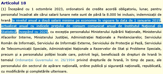 Începând cu data de 01.01.2026 acest articol a fost modificat de Legea 141 / 2025 și au specificat în clar că se acordă 347 lei scoțând mențiunea despre actualizarea cu rata inflației: ”Ordonatorii de credite acordă lunar, pentru personalul încadrat ale cărui salarii lunare sunt de până la 6.000 lei net inclusiv, o indemnizație de hrană de 347 lei lunar.”