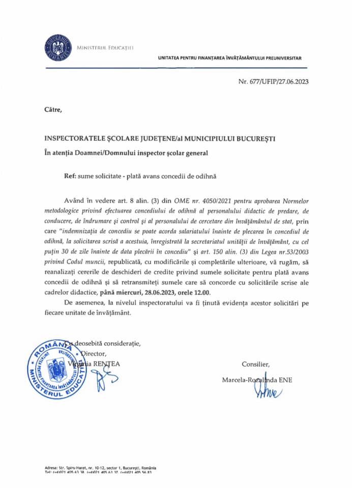 art. 8 alin. (3) din Anexa la Ordinul 4050 / 2021 "Indemnizația de concediu se poate acorda salariatului înainte de plecarea în concediul de odihnă, la solicitarea scrisă a acestuia, înregistrată la secretariatul unității de învățământ, cu cel puțin 30 de zile înainte de data plecării în concediu."